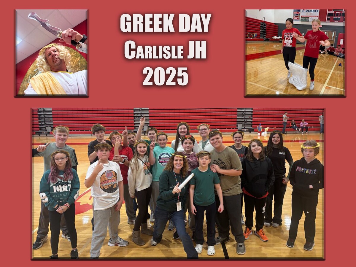 CARLISLE, OH -- This year was the 3rd year in a row that 7th grade students at Carlisle Junior High were able to participate in "Greek Day." In the morning students were sent through 7 stations where they did several hands-on activities related to Greek culture such as the Archimedes Screw, the Pythagorean Theorem, Clay Art works and a theatrical performance. Following the stations the students were able to sample Greek foods such as Gyros, grapes, olives, pita chips & hummus. To conclude the day the students were able to participate in several games related to Greek Olympics with the finale being the Great Chariot Race with a special guest appearance by Zeus (Mr Sprandel, 7th grade Social Studies teacher).