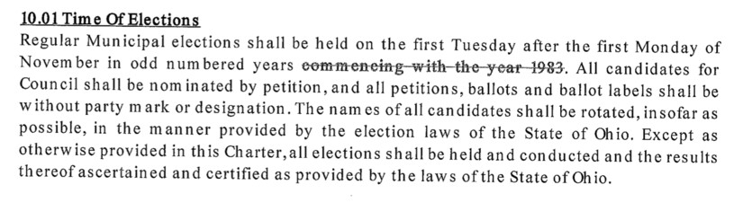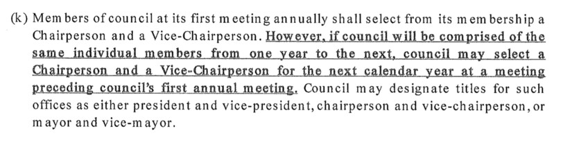 Section 10.01. Words that have lines running through them will be removed if a majority affirmative vote happens for passage.Shall Section 3.03 of the City of Franklin Charter be amended to allow City Council to select a Council Chairperson and Vice-Chariperson for the next calendar year prior to the first Council meeting of that year if Council is composed of the same individual members from one year to he next?