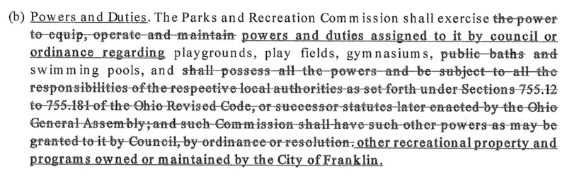 Shall Section 7.03 of the City of Franklin Charter be amended to eliminate specific Parks and Recreation Commission powers in the Charter (Parks and Recreation Commission powers would then only be set forth in the City's Codified Ordinances)?