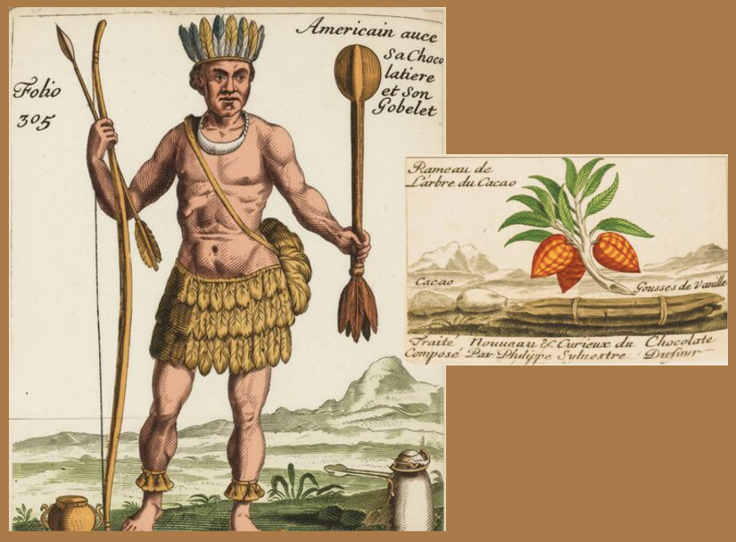 “An American with his chocolate pot and his cup.”Chocolate, though it may seem unusual at a frontier breakfast, was common in the eighteenth century. Travelers often carried compressed cakes of ground cacao mixed with sugar and spices. To prepare it, the chocolate was shaved or broken into pieces and whisked into hot water or milk. A wooden whisk called a molinillo was sometimes used to froth the drink. The result was a thick, warming beverage, slightly bitter and often spiced with cinnamon or vanilla. Chocolate was widely taken in the morning because it was considered strengthening and easy on the stomach.