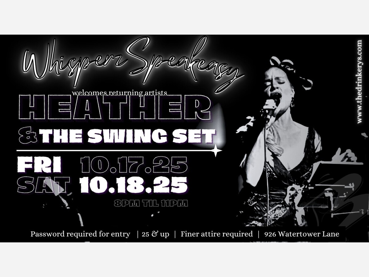 One of our club favorites returning Friday & Saturday, October 17th & 18th, to the Whisperz Speakeasy stage -- Heather & The Swing Set!! This vocally led jazz ensemble will take the stage from 8-11p for two nights of unforgettable live music! Be sure to arrive early, grab a fine handcrafted cocktail and a few small plates, and get settled in for a night you won't want to miss. The show starts at 8p and goes til approximately 11pm.