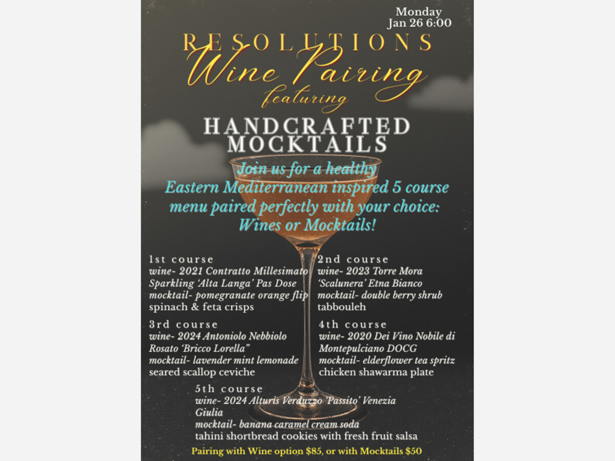 This healthy, Eastern Mediterranean inspired 5 course menu is paired perfectly with your choice: Wines ($85) or Mocktails ($50)!