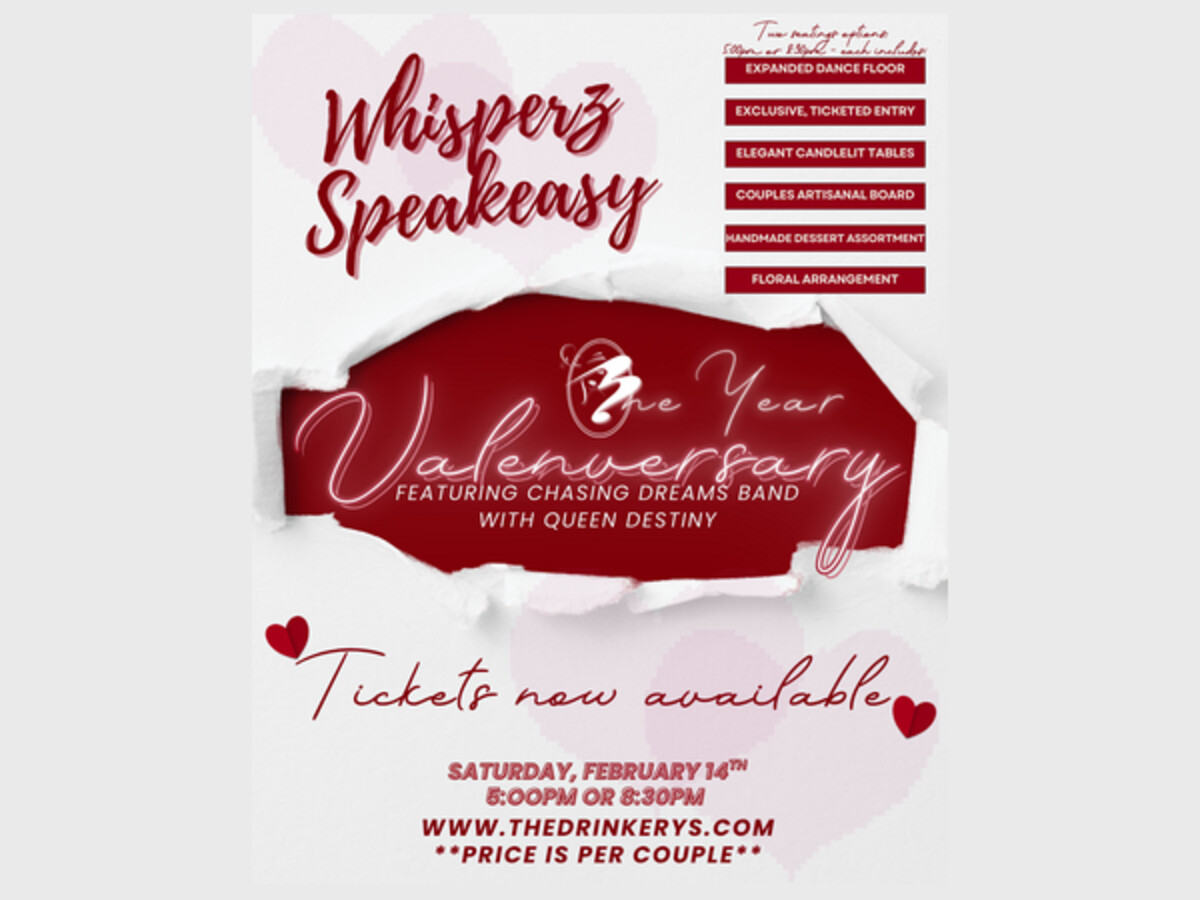 Celebrate love and our first anniversary at Whisperz Speakeasy with an enchanting evening of music & dancing with Chasing Dreams Band featuring Queen Destiny at our One Year Valenversary!