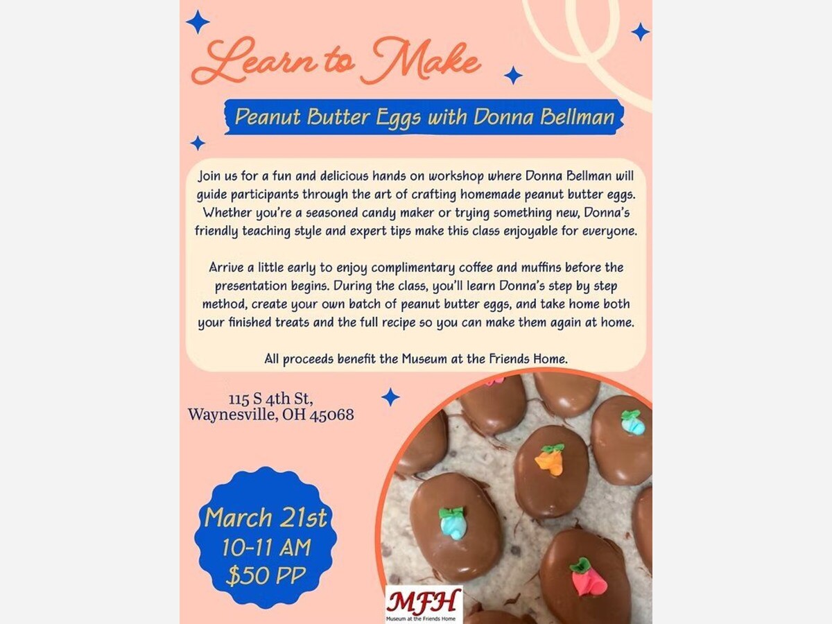 Waynesville, OH- Join us Saturday, March 21st at the Museum at the Friends Home for a fun and delicious hands on workshop where Donna Bellman will guide participants through the art of crafting homemade peanut butter eggs. Whether you're a seasoned candy maker or trying something new, Donna's friendly teaching style and expert tips make this class enjoyable for everyone.
