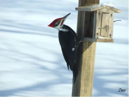 Pileated Woodpecker in Hisey Park, photo credit Dave WoehrI grew up on a farm and often had to feed the cows before I went to school in the winter. I remember dreading the cold in those days, but our house was not too far from the barn, so it was never a long process. Despite spending many of my younger years outside, I never really learned to dress appropriately for the cold. When I started hiking and backpacking with my late husband (a rock and ice climber), I learned how to stay warm and enjoy the outdoors in the winter. Initially, I was annoyed taking layers on and off, but soon realized these layers were the secret to comfort. My biggest fear is getting too hot when I am outside in the winter! I own coats that are too warm to wear anywhere, even in Antarctica (in the summer).