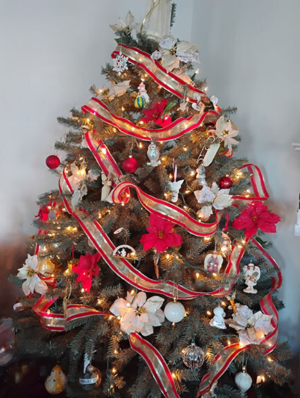 Think about buying “garlands” of beads or a new tinsel to perk up your current tree. The ribbon may not work well unless you use it when you put up the tree.