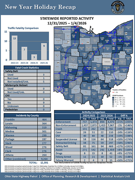 WARREN COUNTY, OH -- The Ohio State Highway Patrol reported nine fatal crashes resulting in nine fatalities on Ohio’s roadways during the 2025-2026 New Year’s holiday, according to provisional statistics. The five-day reporting period began at midnight on Wednesday, December 31, 2025, and ran through 11:59 p.m. on Sunday, January 4, 2025.