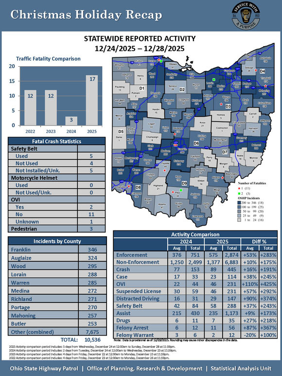 COLUMBUS – According to provisional statistics, 17 people were killed in 14 fatal crashes on Ohio roadways this Christmas holiday. Of the 17 people killed, four were not wearing a safety belt, three involved pedestrians and two were related to OVI. The five-day Christmas reporting period began Wednesday, December 24 at midnight and ran through 11:59 p.m. on Sunday, December 28.
