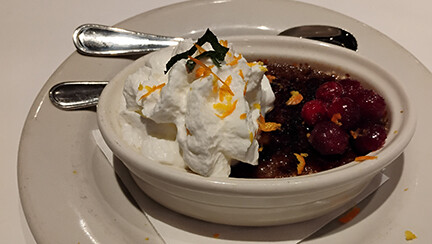 Chocolate Crème Brulee topped with whipped cream and frozen cranberriesThere were many great choices on the Brunch menu, which included Shrimp and Grits and Crème Brulee French Toast. We will likely want to try on a return trip.