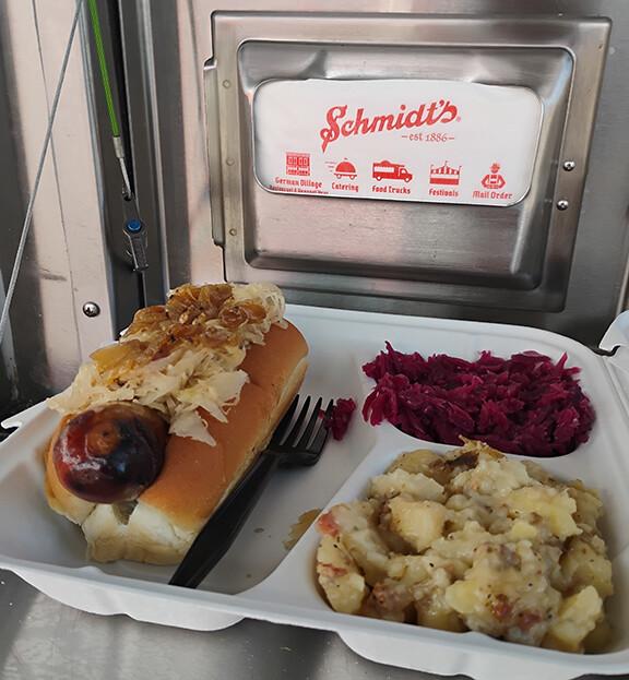 The "BAHAMA MAMA" Sausage platter.The Schmidt specials include their trademarked "BAHAMA MAMA" Sausage, which is hickory smoked beef pork with mustard seed and paprika. ($9.00) with a platter including German Potato Salad and Sweet Red Cabbage ($14.00), which is definitely budget friendly. Other sausage choices include the Pork Bratwurst, Chicken Bratwurst, Frankfurter, and Knockwurst. Also available are hot pretzels with cheese... and for dessert the traditional Cream Puff. During the winter months, they also sell potato soup.