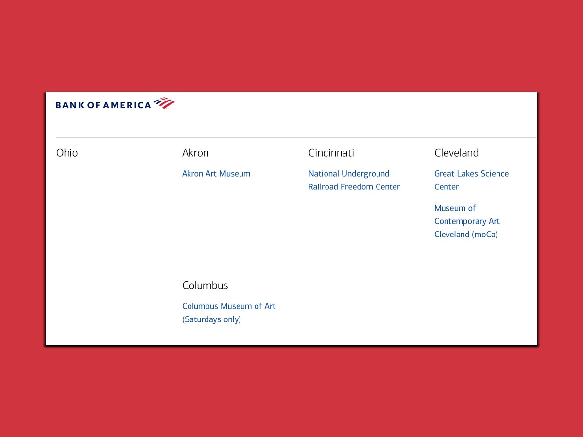 OHIO -- Bank of America, Merrill and Bank of America Private Bank cardholders can receive FREE general admission to four Ohio cultural attractions Saturday and Sunday.