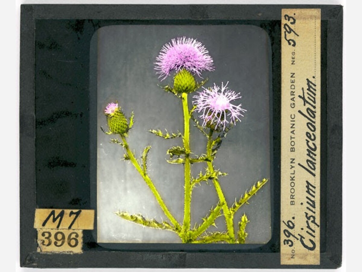Pictured: A lantern slide depicting Cirsium lanceolatum or Bull Thistle flowers; photo & color by E.M. Kittredge, 1911. Courtesy of the Brooklyn Botanic Garden.